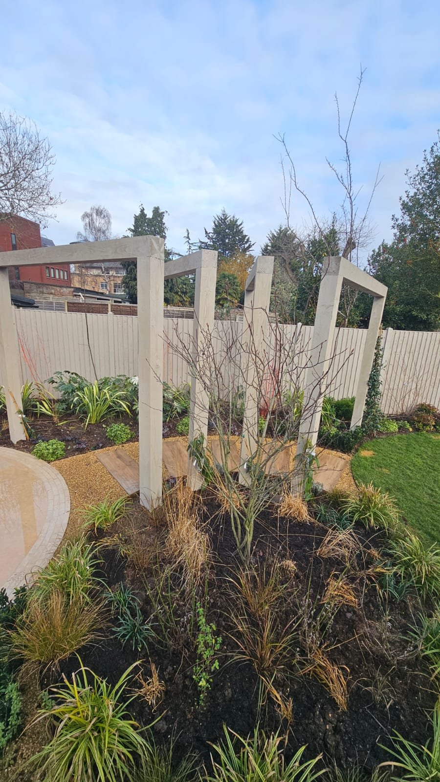 A striking architectural pergola structure forms the garden’s central feature, guiding movement along a curved gravel pathway with stepping stones that lead through the space.