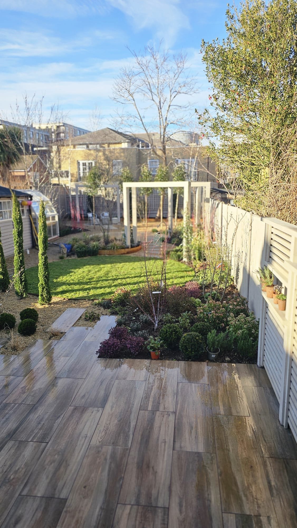 Layered planting beds add texture, colour, and seasonal interest, softening the structure of the hard landscaping and helping the garden feel both elegant and natural.